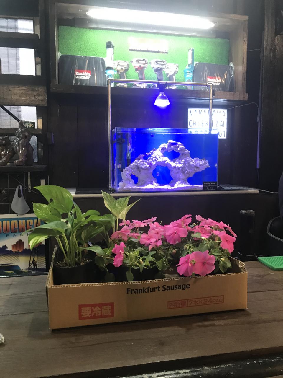 どんどん変わる中の町金物SHOP! ピンクの花に水槽が可愛い笑